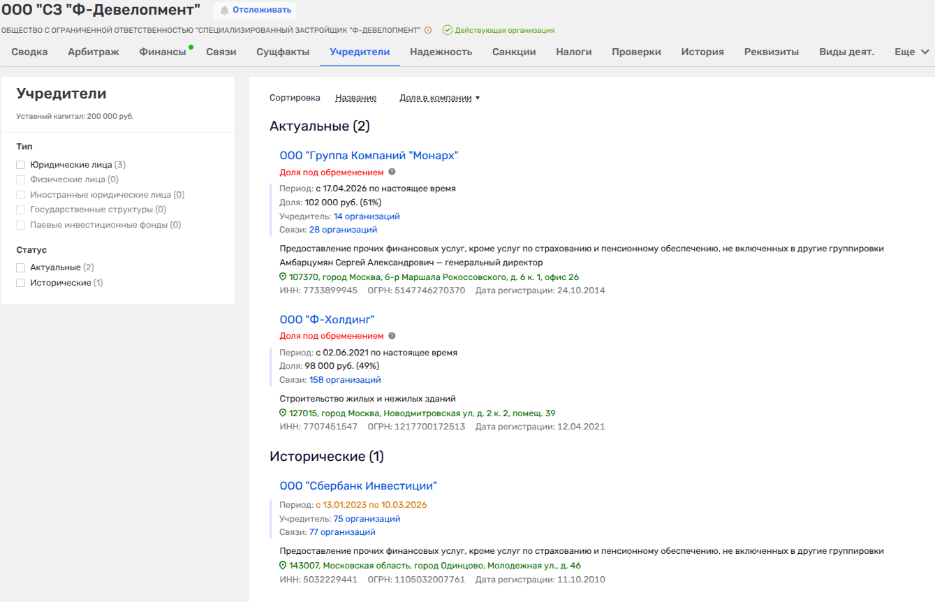 17 апреля 2026 года в числе владельцев ООО СЗ «Ф-Девелопмент» с долей 51% вошло ООО ГК «МонАрх». При этом доля последнего заложена Сбербанку, а буквально за месяц до того из этого бизнеса вышла дочка банка под крылом Грефа - ООО «Сбербанк Инвестиции».