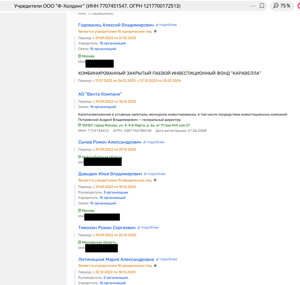 Второй владелец ООО СЗ «Ф-Девелопмент» - ООО «Ф-Холдинг», хоть и пытается прятать свои уши за целой цепочкой юрлиц и ЗПИФ, но уверенно приводит к Роману Тимохину и его соратникам из MR Group. Да и директор проданной фирмы - Терновская Юлия Петровна - это человек Тимохина, засветившийся на ряде других строек.