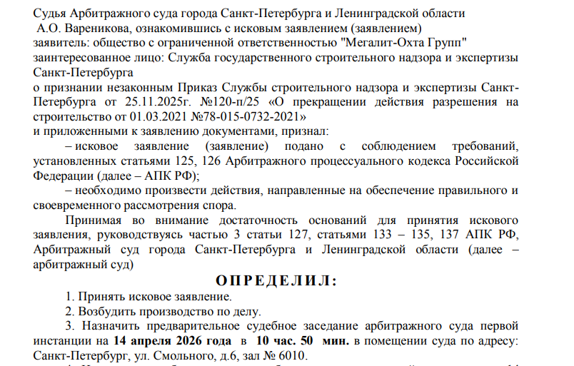Арбитраж Санкт-Петербург и Ленобласти 14 апреля рассмотрит сразу два схожих иска - от ООО «Мегалит-Охта групп» к Службе госстройнадзора и экспертизы Санкт-Петербурга. Суть требования - признать незаконным приказ ведомства от 25.11.2025 г. №120-п/25 «О прекращении действия разрешения на строительство от 01.03.2021 №78-015-0732-2021».
