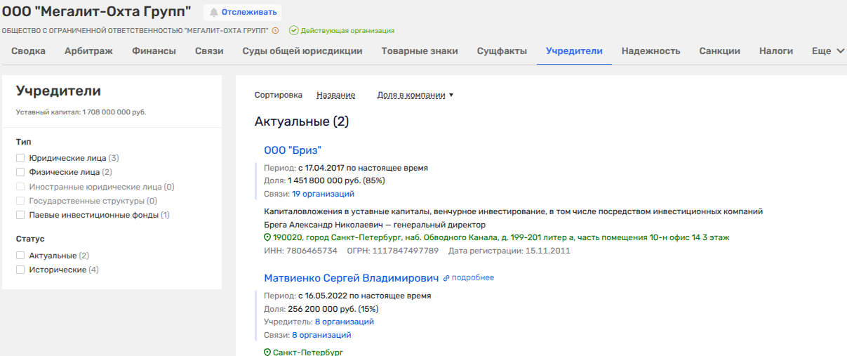 В этом деле весьма любопытен истец - ООО «Мегалит-Охта групп». Владельцами последнего являются ООО «Бриз» Владимира Свиньина и партнеров (через цепочку юрлиц) и Сергей Матвиенко - сын экс-губернатора и действующего сенатора от Санкт-Петербурга, спикера Совфеда Валентины Матвиенко.