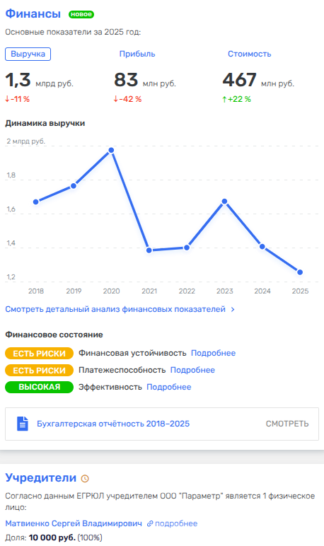 Что интересно, по итогам 2025 года почти все фирмы Матвиенко показали убытки разного размера глубины, но не ООО «Параметр», демонстрировавшее 83 млн рублей чистой прибыли. Спасибо госконтрактам?