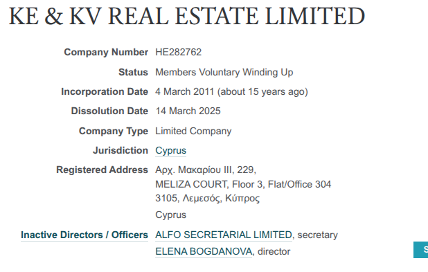 Интересно, что в KE & KV REAL ESTATE LIMITED, которое как раз и было ликвидировано всего какой-то год назад, директором числилась ELENA BOGDANOVA.