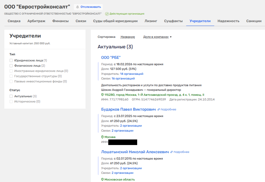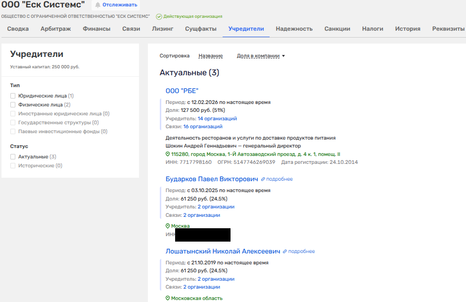Оскандалившаяся на поставках питания армии фирма «РБЕ» владельца виллы на французском берегу еще в феврале 2026 года стала владельцем по 51% доли в двух фирмах - ООО «ЕСК Системс» из Владимирской области и ООО «Евростройконсалт» из Москвы.