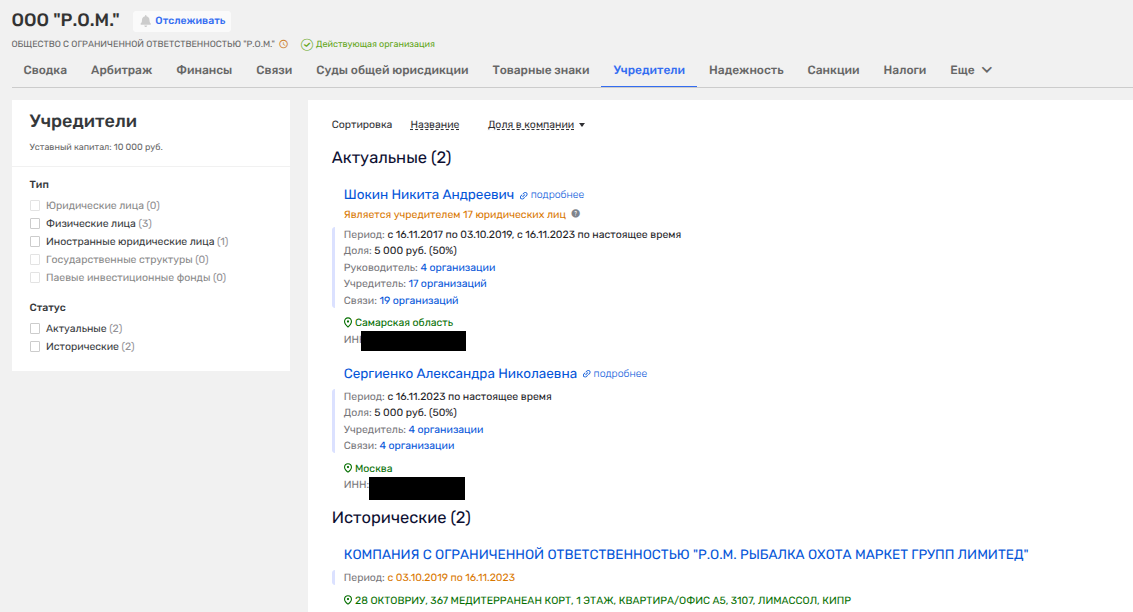 Так, например, в торговой компании «Р.О.М.», где долю имеет Никита Шокин, ранее фигурировало как его партнер кипрское "Р.О.М. РЫБАЛКА ОХОТА МАРКЕТ ГРУПП ЛИМИТЕД" (F.H.M. FISHING HUNTING MARKET GROUP LIMITED). При этом ликвидировали эту фирму, прикрытую техдиректорами из числа киприотов, лишь в мае 2025 года. Видимо, именно отсюда в 2024 году у российской дочки офшора нарисовался убыток в 158 млн рублей. Уплыл в теплые страны?