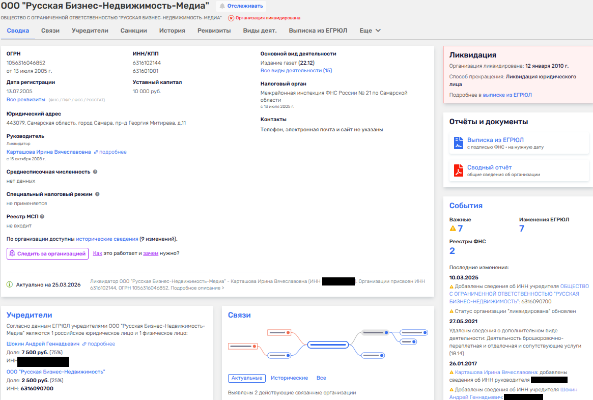 В приватизации спортобъекта участвовало ООО «Русская Бизнес-Недвижимость-Медиа», оформленное на Андрея Шокина и ликвидированное уже после скандала - в 2010 году. При этом владелец 25% в этой фирме - ООО «Русская Бизнес-Недвижимость» - до сих пор вполне себе живая и принадлежит Никите Шокину, получившему актив от отца в 2022 году.