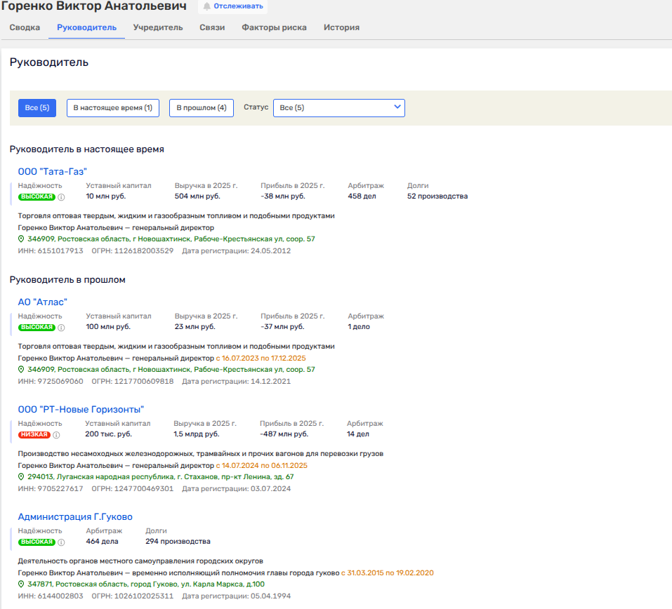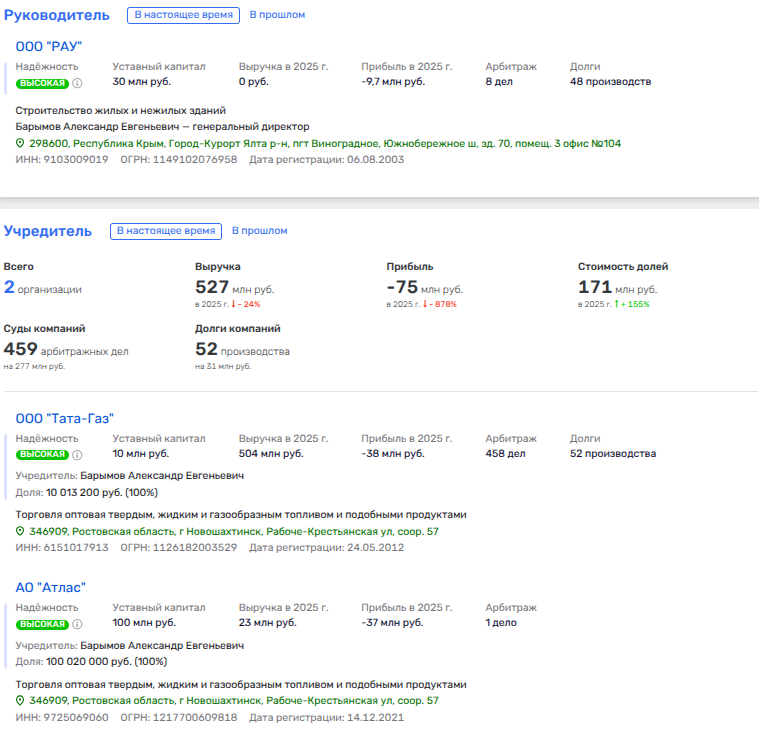 Рулить «РТ-Новые горизонты» с июля 2024-го по ноябрь 2025-го доверили Владимиру Горенко, в прошлом возглавлявшему администрацию ростовского Гуково (2015–2020 гг.). Тот же Горенко параллельно значится гендиректором в компаниях самого Барымова — ООО «Тата-газ» и АО «Атлас». Совпадение? Вряд ли. Дополнительные разъяснения здесь, пожалуй, излишни.