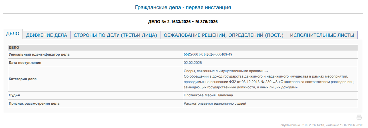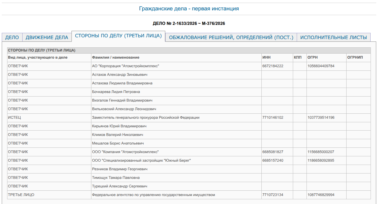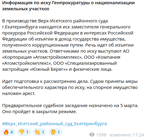 5 марта 2026 года Верх-Исетский районный суд Екатеринбурга рассмотрит иск Генпрокуратуры РФ к трем компания холдинга Атомстройкомплекс - АО «Корпорация «Атомстройкомплекс», ООО «Компания «Атомстройкомплекс», ООО «Специализированный застройщик «Южный Берег», а также 11 физлиц, в числе которых бывшие чиновники, в том числе осужденные по коррупционно-земельному делу.