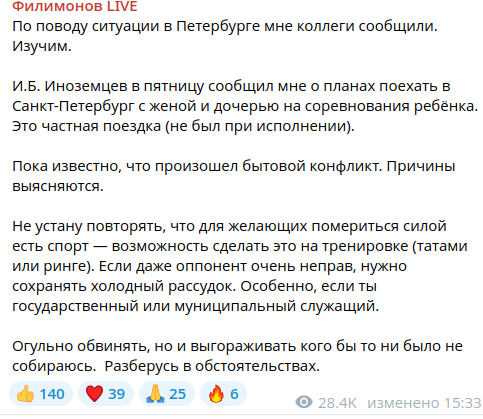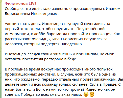 Уже через несколько часов Филимонов, чтобы отбелить уже и свою репутацию, сообщает, что, мол, Иноземцев в драке не участвовал, а ее разнимал. О, как!