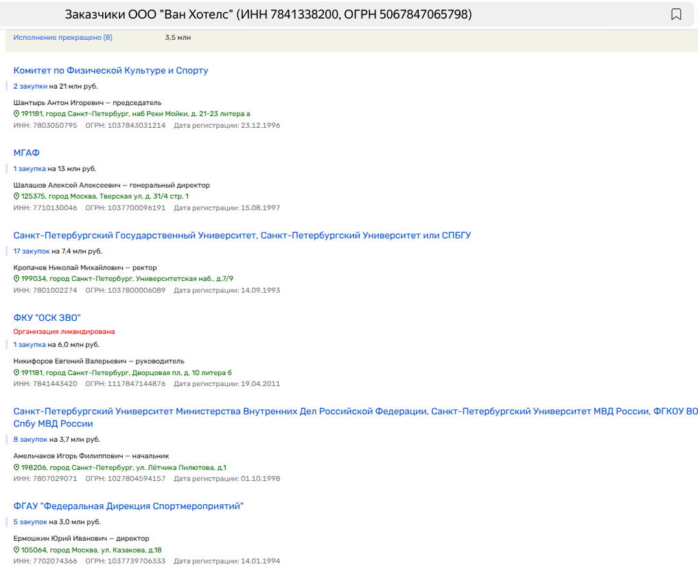 Кстати, ООО «Ван Хотелс» - поставщик по госконтрактам и частенько оказывает услуги спортивным госучреждения Петербурга и даже институту МВД. Памятуя о спортивных соревнования дочери Иноземцева, возникает вопрос, проживание в премиальном отеле он хотя бы оплачивал из своего кармана?
