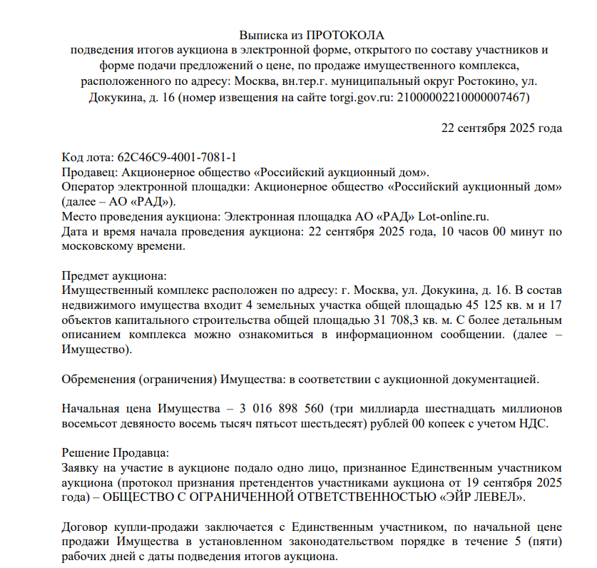 22 сентября 2025 года с молотка ушел имущественный комплекс на ул. Докукина, 16 в Ростокино (Москва). Имущественный комплекс из четырех земельных участка общей площадью 45 125 кв. м и 17 объектов капитального строительства общей площадью 31 708,3 кв. м выкупило ООО «Эйр Левел» — единственный участник аукциона.