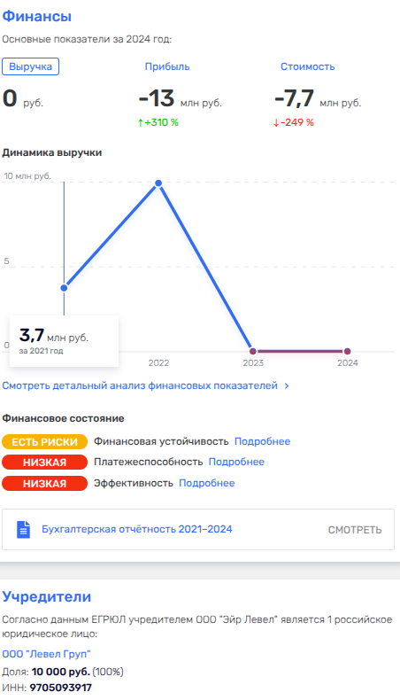 ООО «Эйр Левел», учрежденное в 2021 году, за 2024 год продемонстрировало убыток на 13 млн рублей и имеет минимальный уставный капитал в 10 тыс. рублей. То есть те самые 3 с лишним миллиарда рублей были взяты из другого бизнеса Мошковича. Ловко, не так ли? Запускаешь в госторги техническую пустышку, подкидываешь ей деньжат из-под матраса и денежки легализовал и актив по дешевке прикупил.