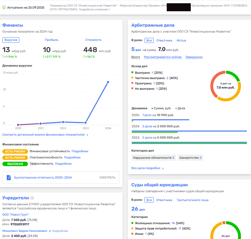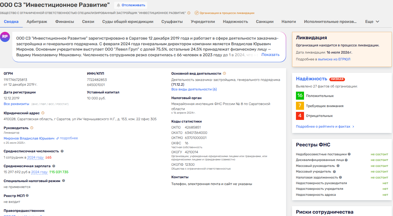 Еще один момент, который вызывает вопросики, - это уровень среднемесячной зарплаты единственного сотрудника ООО «СЗ Инвестиционное Развитие», что составил, судя по Руспрофайл, более 15,2 млн рублей. Последним директором этой мутной ООО-шки и, как следствие, ликвидатором выступает Владислав Миронов, получавший ИНН в Саратовской области. Он же с августа 2025 года директор и владелец некой свежеиспеченной кубышки для организации конференций - ООО «Деловое собрание предпринимателей».
