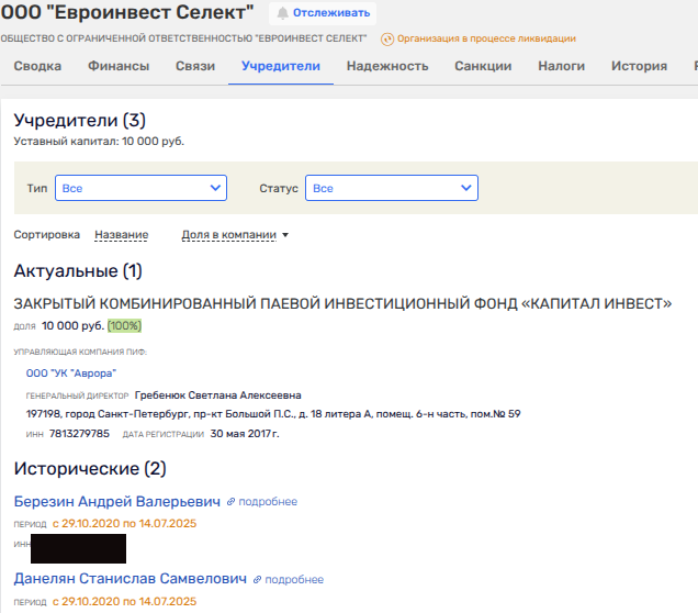Часть же фирм Березин со-товарищи просто ликвидировали. При этом весьма мутны были те операции ликвидации: как и в случае с ООО «Евроинвест Селект», например, ООО «ИК «Евроинвест», прихлопнутой в июне 2024 года, не было убыточным. Прибыль была 239 млн рублей.