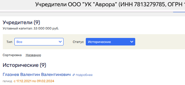 Более того, до лета 2024 года Гребенюк была и совладельцем УК «Аврора», где у нее были весьма примечательные партнеры. Например, Валентин Глазнев (вышел в феврале 2024 года из числа владельцев УК), который одновременно с этим в 2013-2022 годы был гендиректором ООО «Компания «Аудитэксперт», где доля была у Березина и партнеров.