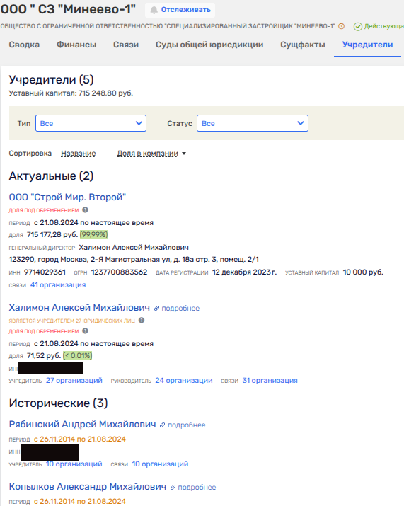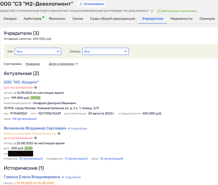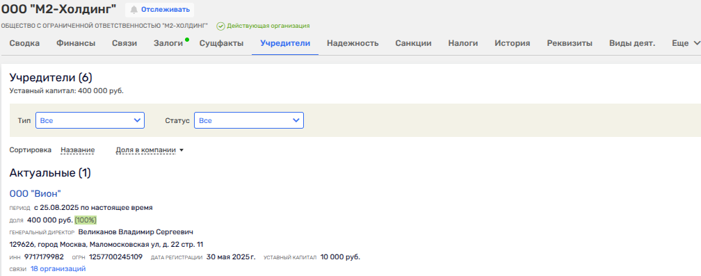 25 августа 2025 года сразу у двух бывших юрлиц, связанных с МР Групп Романа Тимохина, близкого как к Собянину, так и к Грефу, сменились собственники. По цепочке обе фирмы - ООО СЗ «М2-Девелопмент» и ООО «М2-Холдинг» - были проданы ООО «Вион».