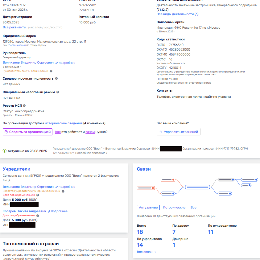 Владельцами компании «Вион» являются Никита Косарев и Владимир Великанов, которые, судя по данным Руспрофайл, за 2024 год от своих активов получили скромную прибыль. Да и большинство активов с их участием были учреждены в 2024-2025 годы, то есть совсем свежак.