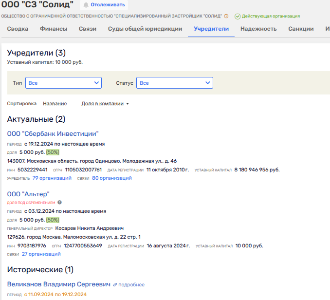 И вот что удивительно, в ряде этих фирм в качестве партнёра мы видим ООО «Сбербанк Инвестиции». Именно с последним ООО «Альтер» Косырева, созданное в 2024 году, и ООО СЗ «Солид», учреждённое Великановым, выкупило ООО «РТГ-Активы» (бывший Ространсгаз). Продавцом последнего стал Павел Тё - основатель Капитал Групп и перекупщик Собянина.