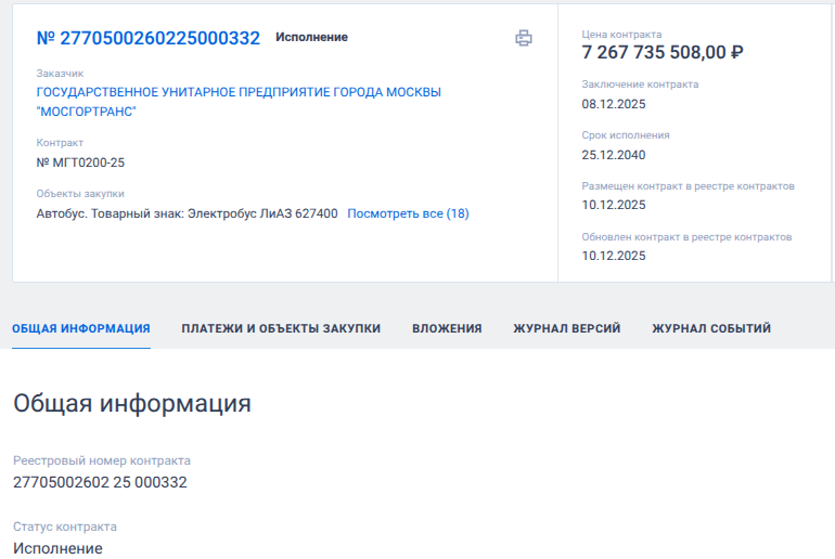 8 декабря 2025 года Мосгортранс подмахнул госконтракт единственному участнику. Речь шла о поставке 100 городских электробусов большого класса с оказанием услуг по их последующему сервисному обслуживанию и ремонту в течение 15 лет.