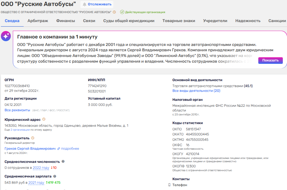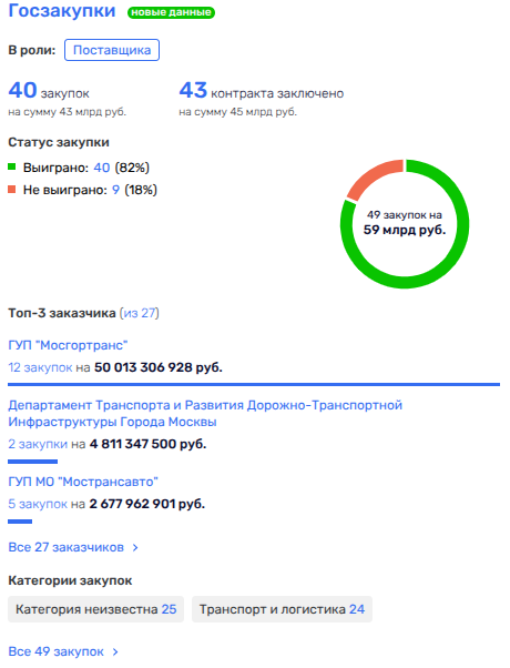При этом, судя по Руспрофайл, у фирмы - 0 сотрудников, хотя средняя зарплата - 543 тыс. рублей в месяц. Но, видимо, это зарплата директора, которого вроде как там нет (0 сотрудников же). При этом фирма по торговле автотранспортными средствами предпочитает не светить результатами. Последний раз годовые итоги они раскрывали в 2022 году: выручка - 2,3 млрд рублей, прибыль - 98 млн рублей. И это, на минуточку, поставщик по госконтрактам на 59 млрд рублей, из которых как раз таки Мосгортранс обеспечил 50 млрд рублей.