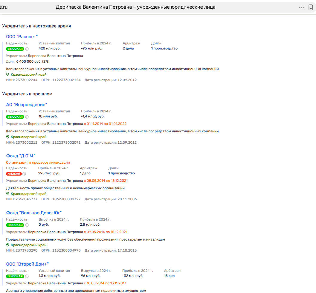 То что это не просто тезка, намекает, что в Фонде «Вольное Дело-Юг» дама была соучредителем с сыновьями - олигархом Дерипаской и бывшим депутатом Госдумы Павлом Езубовым. Кстати, последний сейчас директор некоммерческого фонда «Фиделитас», который работает в сфере денежного посредничества. Учредителем фонда был очередной офшор - кипрская ФАЙДЕЛИТАС ИНВЕСТМЕНТС ЛИМИТЕД.