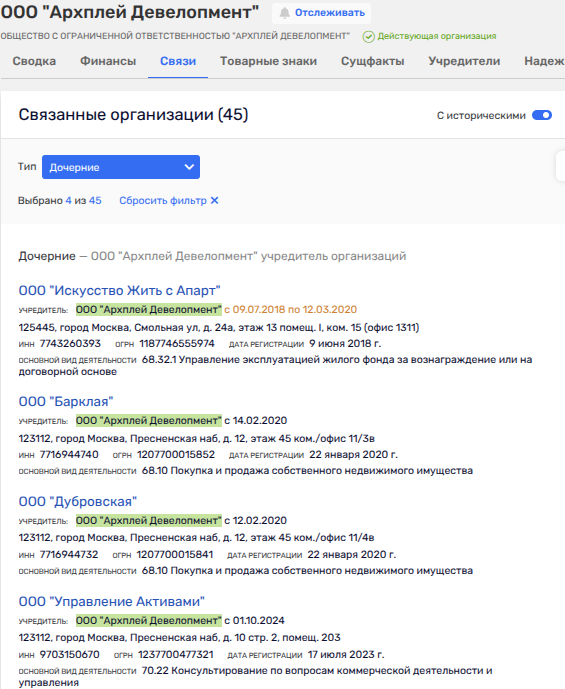 В свою очередь ООО «Архплей Девелопмент» владеет долями в трёх компаниях - ООО «Барклая», ООО «Дубровская» и ООО «Управление Активами». Последнее с апреля 2025 года владеет свежеучрежденным ООО «Экселенс», которое в свою очередь имеет долю в ООО «Силикатный Плаза», что выкуплено у дивизиона Интеррос олигарха Потанина.