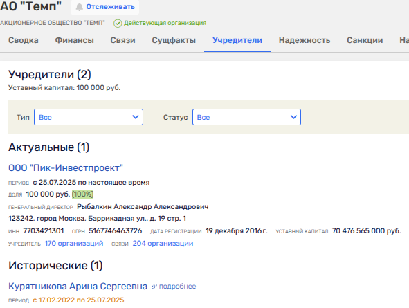 В АО «Темп», учрежденном в 2022 году, в конце июля 2025 года сменился собственник - вместо ширмы из физлица владельцем стало ООО «ПИК-Инвестпроект» экс-сенатора Сергея Гордеева. Но, судя по всему, ранее фирмы также имела отношение к нему - директор, назначенный в 2023 году, также руководил несколькими кубышками Гордеева. Между тем, официальным владельцем была г-жа Курятникова. Сейчас Гордеев, что называется вскрыл карты.