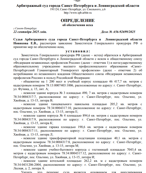 22 сентября 2025 года Генпрокуратура подала иск об изъятии из чужого незаконного владения общежития на 1,2 тыс. мест, учебного корпуса площадью 46 417,7 кв. метров и семи прочих зданий. Ответчик - Санкт-Петербургский гуманитарный университет профсоюзов (негосударственное образовательное учреждение) и Общероссийский союз «Федерация независимых профсоюзов России». Заседание назначено на 20 ноября, но имущество взято под арест, чтобы ректор Александр Запесоцкий не смог ему приделать ноги, как он умеет.