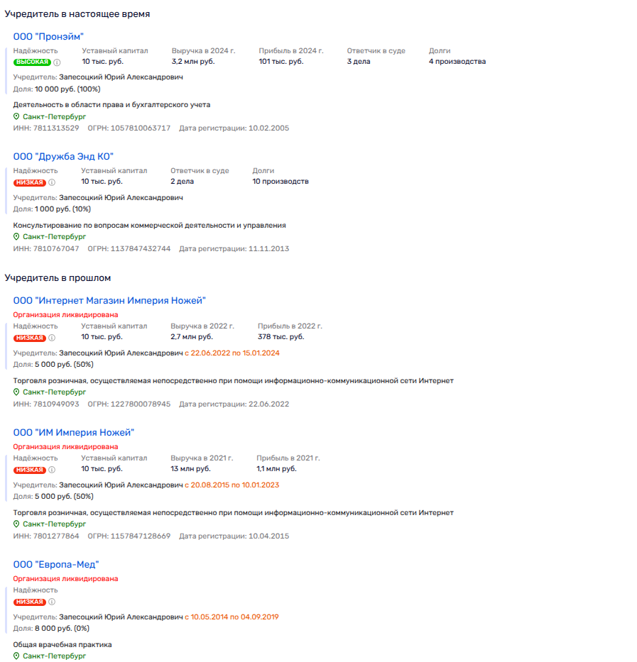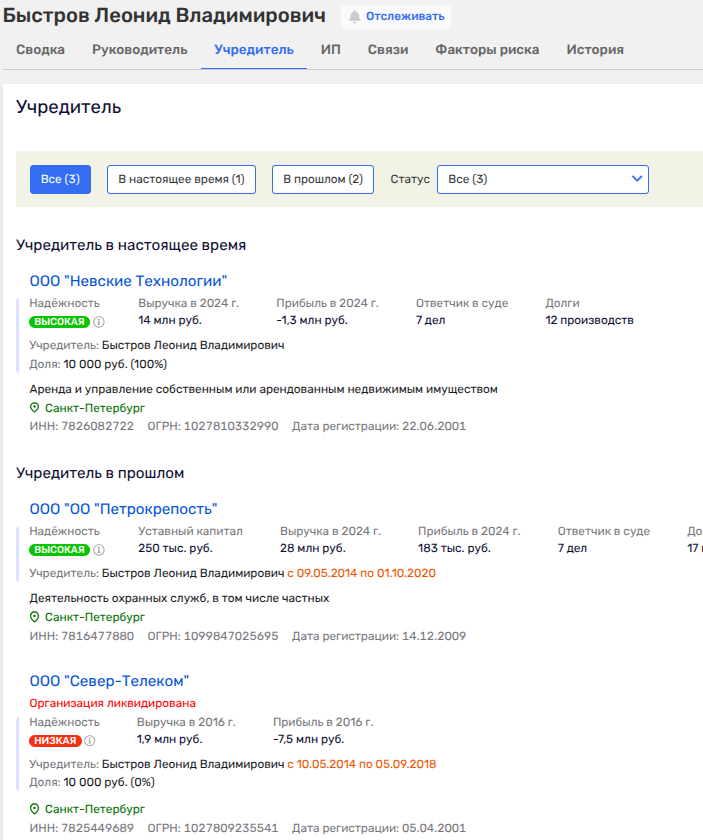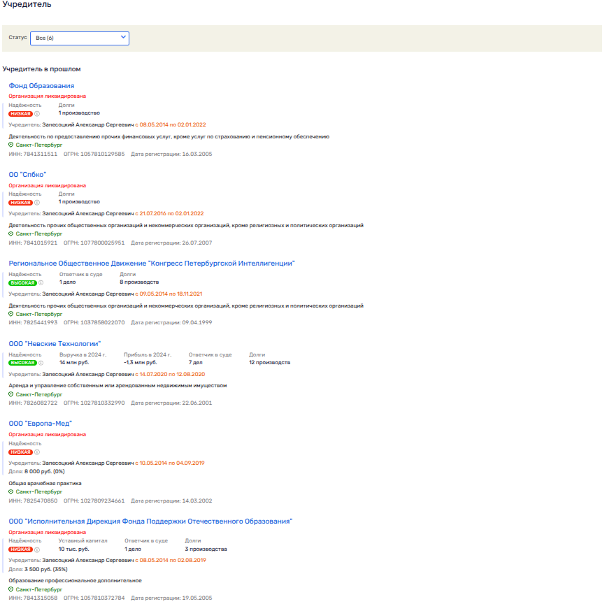 Александр Запесоцкий был лично владельцем ООО «Невские технологии», ООО «Европа-Мед» (владел им вместе с сыном Юрием) и ООО «Исполнительная дирекция Фонда поддержки отечественного образования». При этом ООО «Невские технологии» все еще действующий актив, работающий в сфере недвижимости. Его Запесоцкий передал доверенному лицу - Леониду Быстрову.