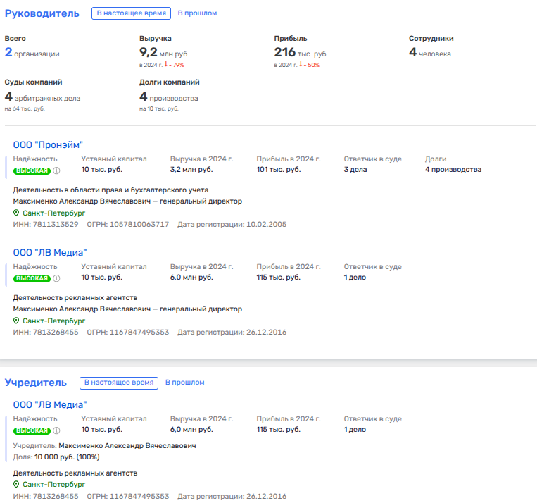 Директором ООО «Пронэйм» является Александр Максименко, которому и принадлежит упомянутое в деле ректора ООО «ЛВ Медиа».