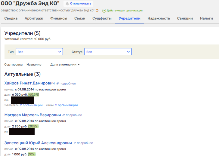 У Юрия Запесоцкого весьма интересные партнеры по ООО «Дружба Энд КО». Так, Марсель Магдеев - полный тезка уголовника, который в 2019 году был осужден за незаконную банковскую деятельность, будучи фигурантом дела о многомиллионных хищениях на строительстве объектов Минобороны в Арктике. Следствие посчитало, что Магдеев предоставлял услуги обналичивания подрядчикам министерства, получив 47 млн рублей. Изначально Магдеев сбежал от следствия в Испанию, но был пойман.