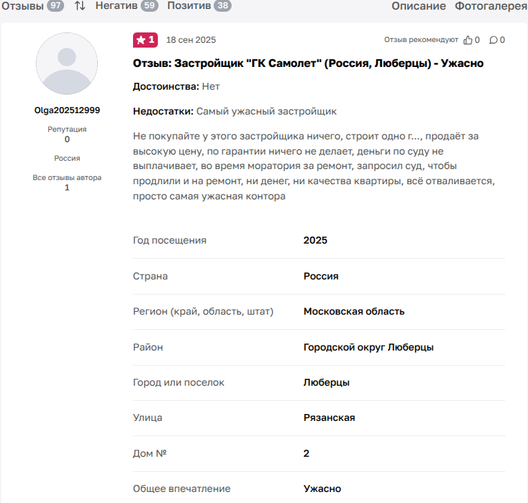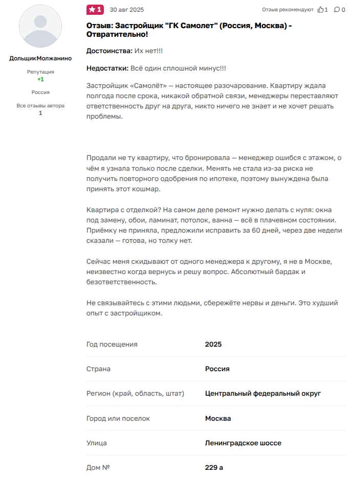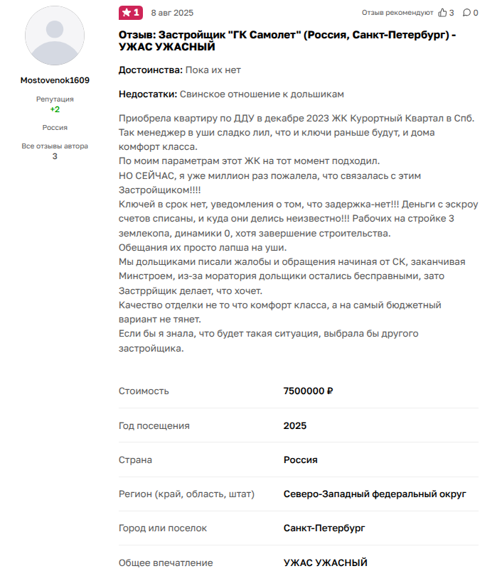 Покупатель жилья из Петербурга в августе 2025 года пишет: «Застройщик "Самолет" недобросовестен в исполнении своих обязательств. По условиям договора заселение должно было состояться 10 июня 2025, но до настоящего времени ключи не переданы, а в нашей квартире нет даже черновой отделки. Представитель застройщика неоднократно нарушал договоренности, обещания ускорить отделку, поменять подрядчиков. На настоящий момент в 3 очереди нет никакой динамики. Деньги с эскроу-счета списаны, мы со своей стороны исполняем обязательства, но застройщик не исполняет свои. Не советую покупать у него квартиры».