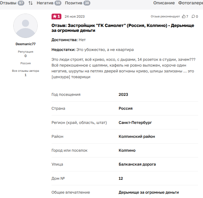 Покупатель в Колпино: «Это люди строят, все криво, косо, с дырами, 14 розеток в студии, зачем??? Все перекошенное с щелями, кафель не ровно выложен, короче один негатив, шурупы на петлях дверей вогнаны криво, шлицы зализаны ... это [цензура] товарищи».
