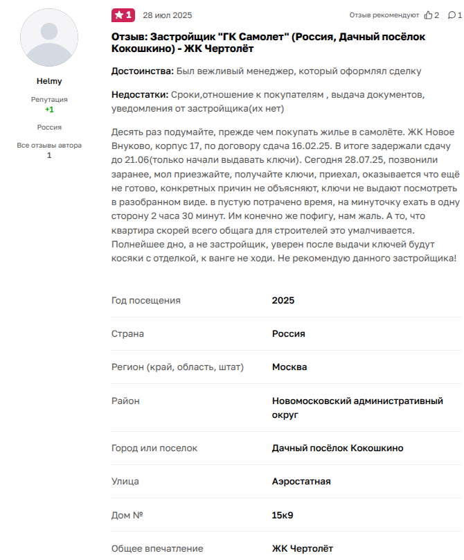 Покупатель из поселка Кокошкино: «Недостатки: Сроки,отношение к покупателям , выдача документов, уведомления от застройщика (их нет). Десять раз подумайте, прежде чем покупать жилье в самолете. ЖК Новое Внуково, корпус 17, по договору сдача 16.02.25. В итоге задержали сдачу до 21.06(только начали выдавать ключи). Сегодня 28.07.25, позвонили заранее, мол приезжайте, получайте ключи, приехал, оказывается что еще не готово, конкретных причин не объясняют, ключи не выдают посмотреть в разобранном виде. в пустую потрачено время, на минуточку ехать в одну сторону 2 часа 30 минут. Им конечно же пофигу, нам жаль. А то, что квартира скорей всего общага для строителей это умалчивается. Полнейшее дно, а не застройщик, уверен после выдачи ключей будут косяки с отделкой, к ванге не ходи. Не рекомендую данного застройщика!».