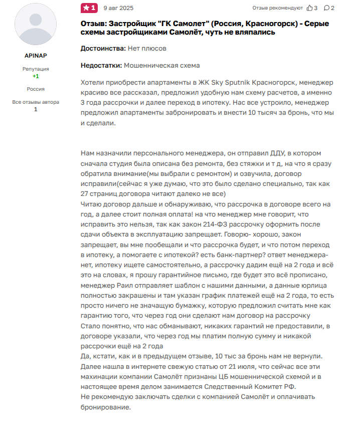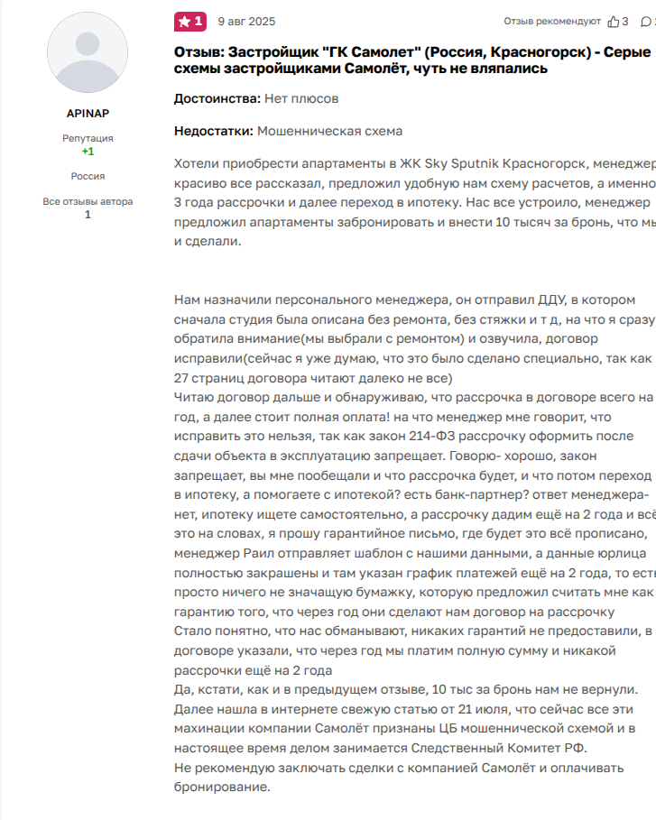 И, чтобы не быть голословными, снова отзывы реальных клиентов воробьевского Самолета.