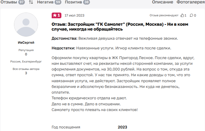 Отзыв покупателя в ЖК Пригород Лесное: «Оформили покупку квартиры в ЖК Пригород Лесное. После сделки, вдруг, нам выставляют счет, на реквизиты некой сторонней компании, за услуги оформления документов, на 30,000 рублей. На вопрос о том, откуда эта сумма, ответ простой. У нас так принято. Ни какие доводы о том, что это навязанная услуга, не действуют. Застройщик проявляет полное безразличие и абсолютную безнаказанность. Ни куда не денетесь, оплатите. Телефон юридического отдела не дают. Дело не в сумме. Дело в отношении. Самолету просто плевать на своих клиентов!».