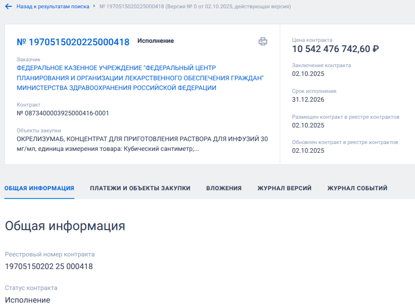 2 октября 2025 года ФКУ «ФЦПиЛО» Минздрава России подписало контракт на 10,5 млрд рублей с единственным участником соответствующего тендера. На эту сумму фирма «Р-Фарм» должна поставить препарат Окрелизумаб из списка лечения редких болезней. Тех самых, лечение которых влетает в копеечку. Препараты для орфанных заболеваний - это шанс для больных редкими болезнями и возможность обогатиться для других. Таких как Репик.