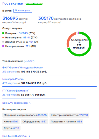 За годы существования АО «Р-Фарм» наколотило на госконтрактах 715 миллиардов рублей. Это сопоставимо с тремя годовыми бюджетами не самых нищих российских регионов. При этом 108 млрд из суммы обеспечило как раз ФЦПиЛО, а еще 107 млрд - сам Минздрав РФ.