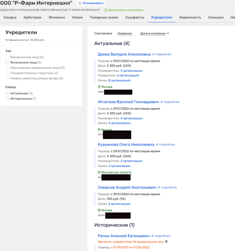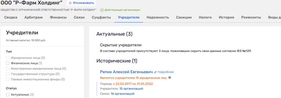 Тут следует отметить, что свои уши Репик скрывает, запретив указывать данные о себе как владельце одной из компаний-акционеров Р-Фарма - ООО «Р-Фарм Холдинг». Ранее СМИ сообщали, что в числе владельцев ООО оказался гендиректор Р-Фарм Василий Игнатьев и Валерия Даева - мать Репика, которая числится заместителем гендиректора. Отжалели дольку и директору по правовому обеспечению «Р-Фарм» Ольге Курьяновой.