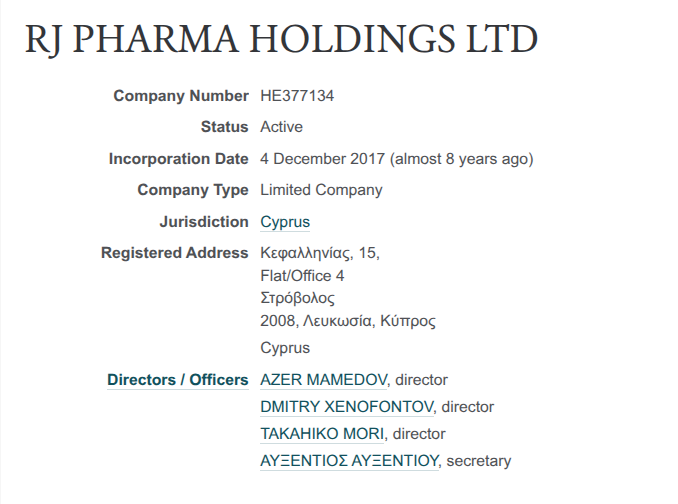 RJ PHARMA HOLDINGS LTD создано на Кипре в 2017 году. Директорами в ней числятся AZER MAMEDOV, DMITRY XENOFONTOV, TAKAHIKO MORI. Последний явно связан с Мицуи.