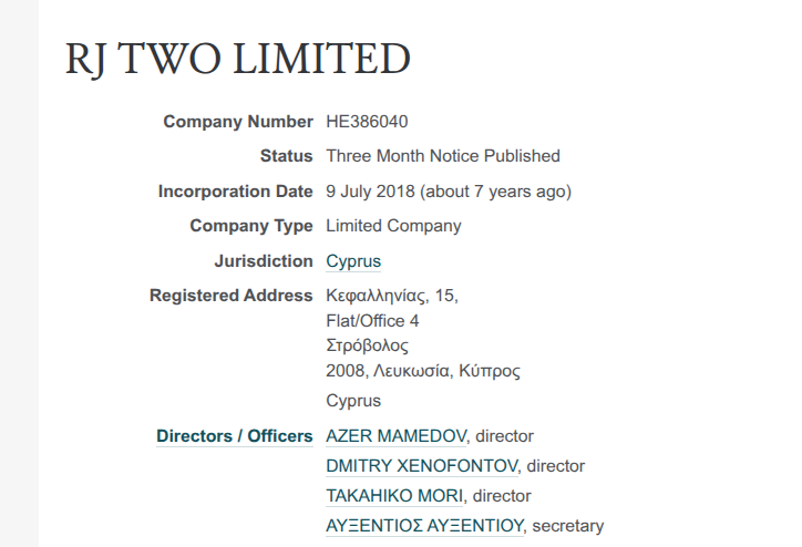 Тут стоит отметить, что тем же составом руководители наследили в кипрской RJ TWO LIMITED. Ксенофонтов же оказался более плодовит на кубышки и отметился ранее также в ABEGA INVESTMENTS LIMITED, NEMBA TRADING LIMITED и TROUZANO ENTERPRISES LIMITED, что ныне ликвидированы.