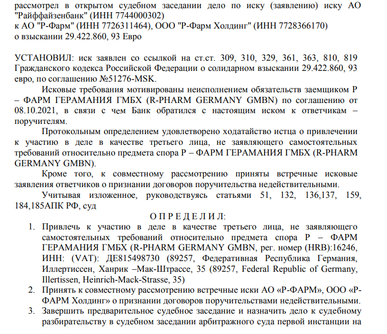 При этом ранее Райффазенбанк, который в России ославился незаконной блокировкой счетов клиентов и участием в многочисленных скандалах, также обращался с иском к Р-Фарм и ООО "Р-Фарм Холдинг", требуя 29.422.860, 93 Евро долга. Известно, что деньги - это кредит, выданный R-PHARM GERMANY GMBN по соглашению от 08.10.2021 года, а ответчики - поручители. Дело пока слушается в суде.