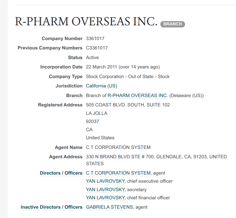 А еще не стоит забывать о том, что еще в 2011 году в США была основана компания R-Pharm Overseas, Inc, а одновременно с покупкой завода в Германии начало операционную деятельность в США и Японии, открыты новые филиалы в Казахстане, Беларуси и Азербайджане. На сегодня американская фирма Репика вполне действующая, ею рулит некий YAN LAVROVSKY, связанный еще с рядом компаний в США.