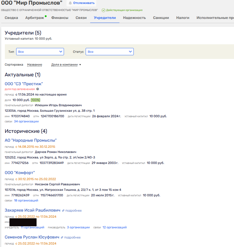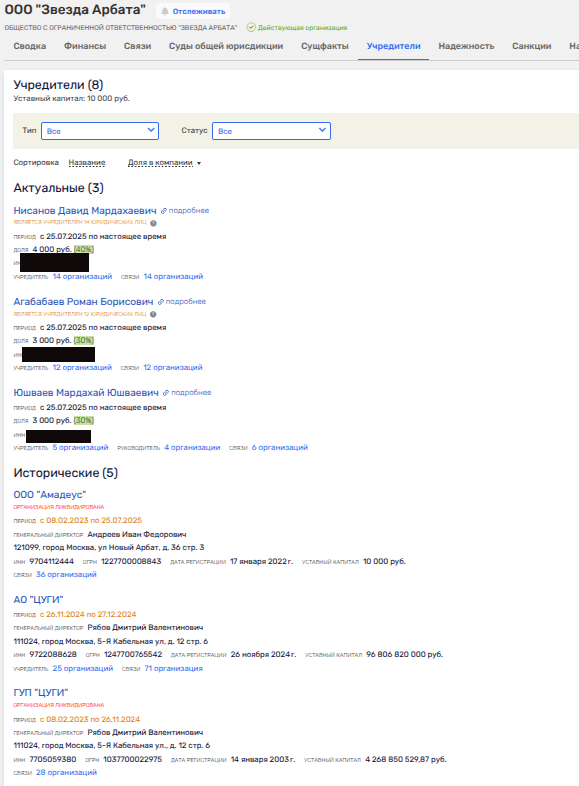 Более того, Давид Нисанов владеет долей и в ООО «Щелковская площадь», где его партнёром проходит Вадим Семенов. Возможно, родственник вышеуказанного бенефициара Sezar Group. А по ООО «Флора и фауна» он связан с Артуром Захаряевым (это один из вариантов написания фамилии Захаряев)