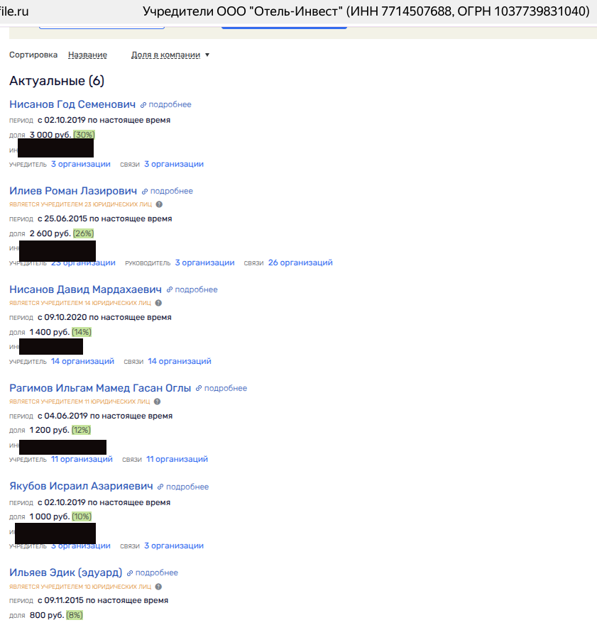 Непосредственно на самого Года Нисанова оформлено удивительно мало фирм. Вместе с Давидом Нисановым и рядом вышеуказанных фамилий он, например, владеет ООО «Отель-Инвест».