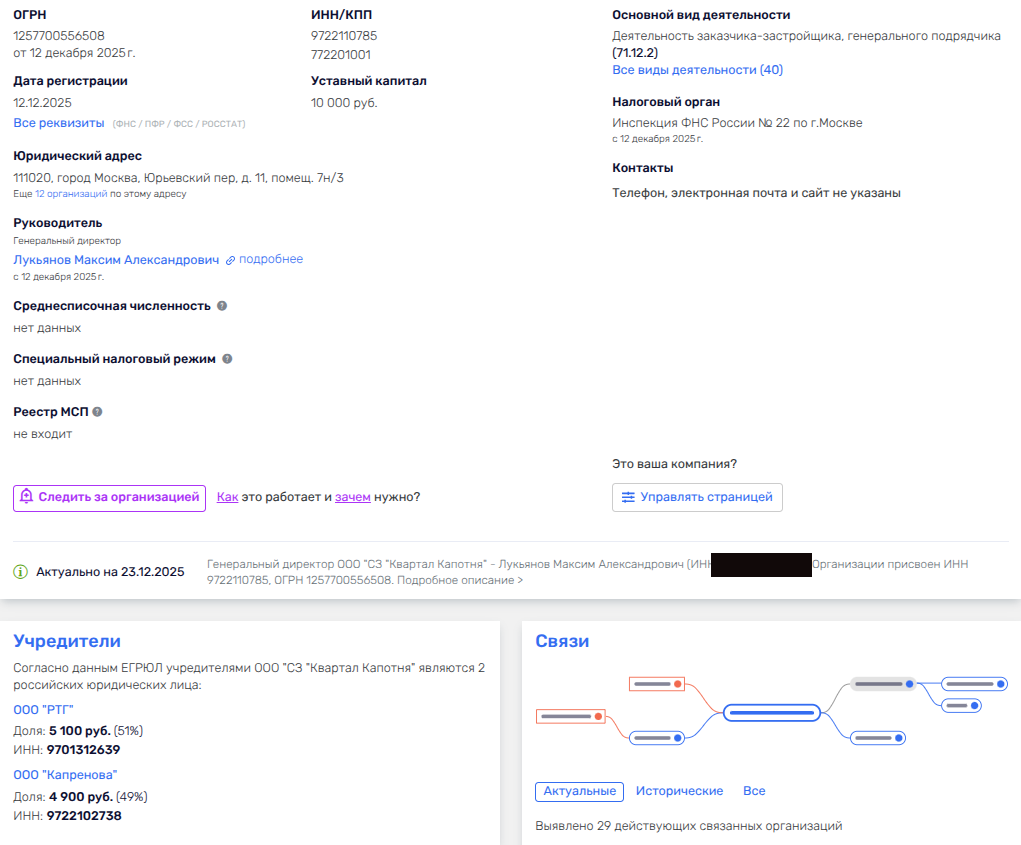 12 декабря 2025 года в ЕГРЮЛ появилась новая компания с ОКВЭД - застройщик-заказчик и, судя по названию, - ООО «СЗ Квартал Капотня» речь пойдёт о стройке в Капотне.