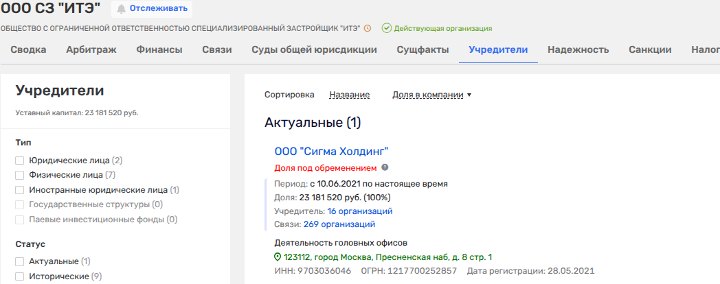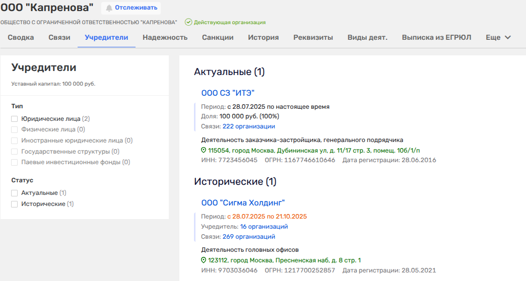 Так, ООО «Капренова», учрежденное 28 июля 2025 года, принадлежало ООО «Сигма Холдинг», вышедшему в конце октября 2025 года, и ООО «СЗ ИТЭ» - преемнику АО «Интертрансэкспедиция», что некогда было госактивом и было в собственности департамента имущества Москвы.