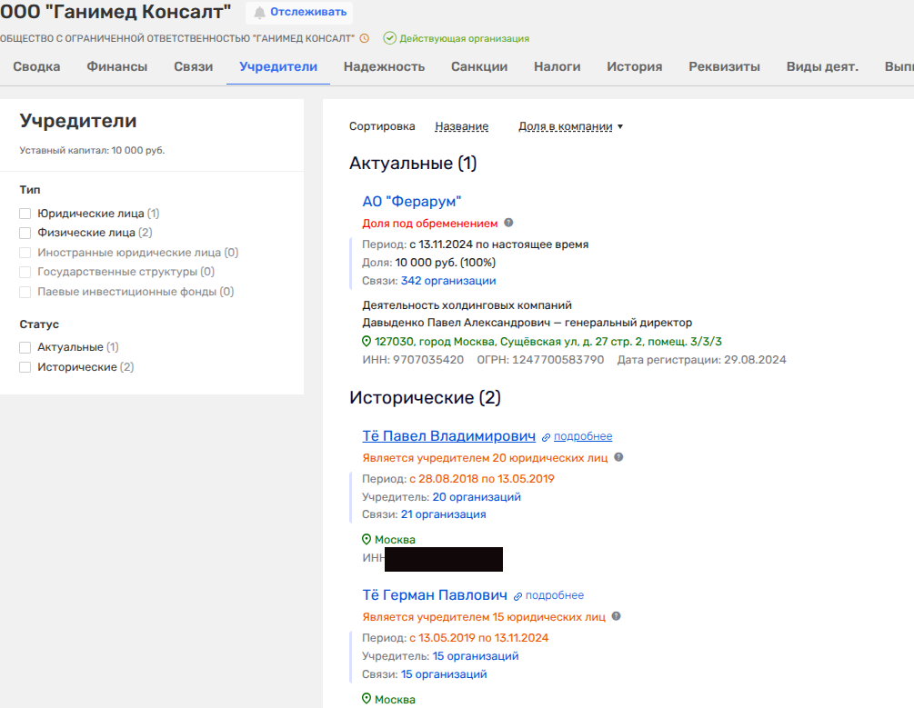 При этом уши семейства Те в ООО «Ганимед Консалт» в ноябре 2024 года попытались спрятать за сляпанным в августе 2024 года АО «Ферарум», что скрывает своих бенефициаров. Вот только единая госбаза жилстроительства светит конечными бенефициарами - Те и Гордеев. Да и директором в АО Павел Давыденко, что не раз мелькал в дивизионе Те.