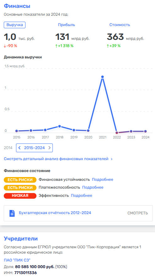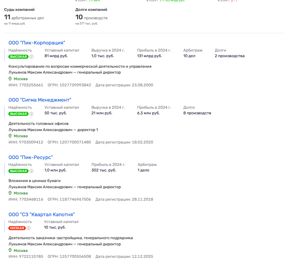 Кстати, свежесляпанное ООО «СЗ Квартал Капотня» возглавил владелец пачки компаний-ликвидантов Максим Лукьянов, который является директором ООО «ПИК-Корпорация», что при выручке в 1 тыс. рублей в 2024 году показало чистую прибыль на 131 млрд рублей. Удивительная математика, не так ли?