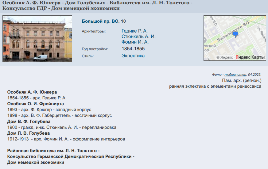 Как здание-памятник архитектуры, построенное в 1855 году, более известное как особняк А. Ф. Юнкера, оказался в руках сына бывшего губернатора Петербурга Матвиенко, история также умалчивает.