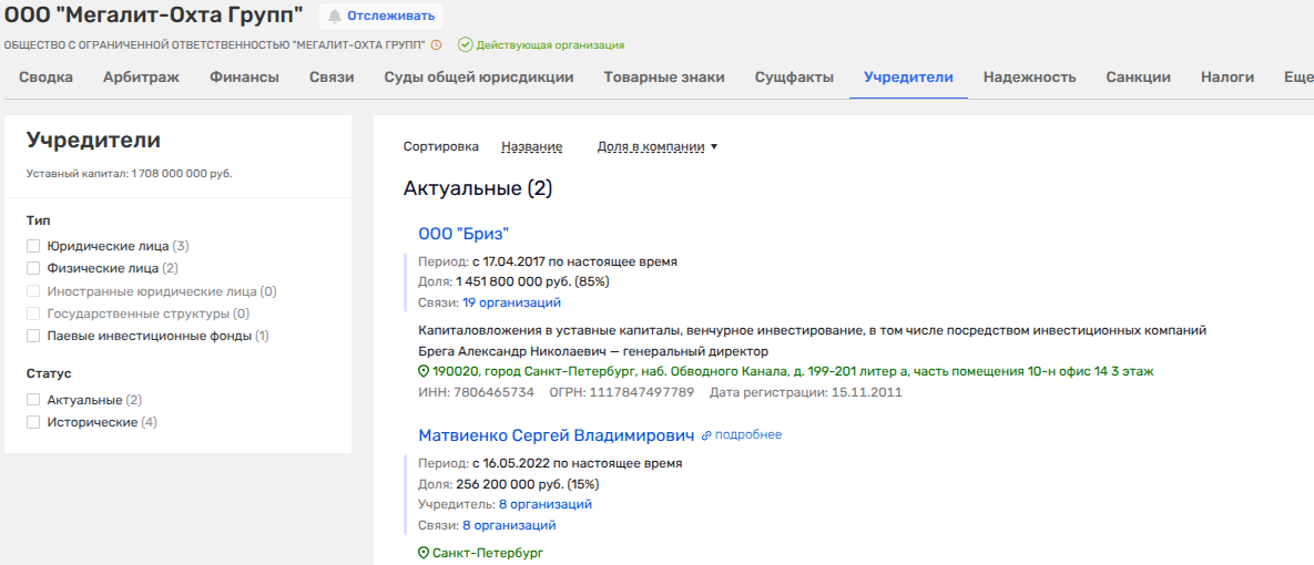 Свою дольку пирога Матвиенко может получать и через связи с миллиардером Владимиром Свиньиным, с коим он владеет ООО «Мегалит-Охта Групп».